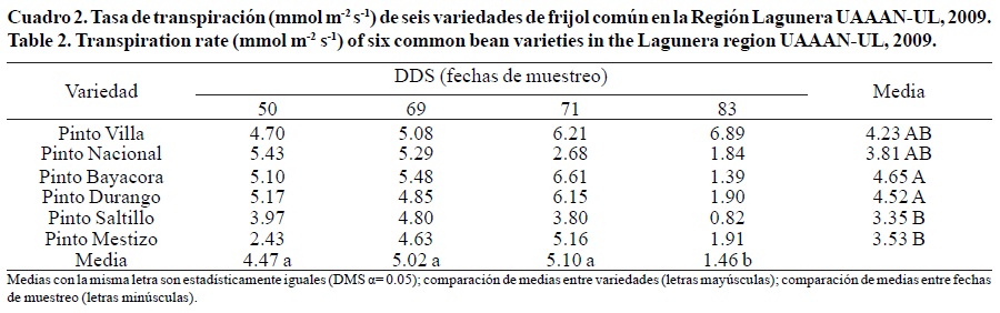 La tasa de transpiración que se generó en las variedades Pinto Bayacora y Pinto Durango mostraron los valores más altos con 4.65 y 4.52 mmol m-2 s-1. Estas variedades fueron estadísticamente iguales a las variedades Pinto Villa y Pinto Nacional, las cuales presentaron una tasa de transpiración de 4.23 y 3.8 1 mmol m-2 s-1; a la vez, éstas dos últimas variedades también presentaron igualdad estadística con las variedades Pinto Mestizo y Pinto Saltillo con 3.53 y 3.35 mmol m-2 s-1 (Cuadro 2).
