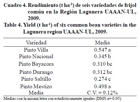 En el Cuadro 4 se presenta la producción obtenida en las seis variedades de frijol evaluadas. El análisis estadístico encontró diferencia significativa entre variedades. Las variedades Pinto Villa y Pinto Mestizo presentaron el rendimiento más alto de 0.547 y 0.498 t ha-1 respectivamente resultando estadísticamente iguales entre ellas. La variedad Pinto Nacional presentó una producción de 0.35 t ha-1 estadísticamente igual a las variedades Pinto Bayacora con 0.3 10 t ha-1 y Pinto Durango 0.312 t ha-1; éstas dos últimas resultaron estadísticamente igual a la variedad Pinto Saltillo la cual presentó la producción más baja con 0.274 t ha-1. Las variedades que obtuvieron el rendimiento más alto, superaron al reportado por el SIAP 2009 para el municipio de Torreón, el cual es de 0.38 t ha-1.