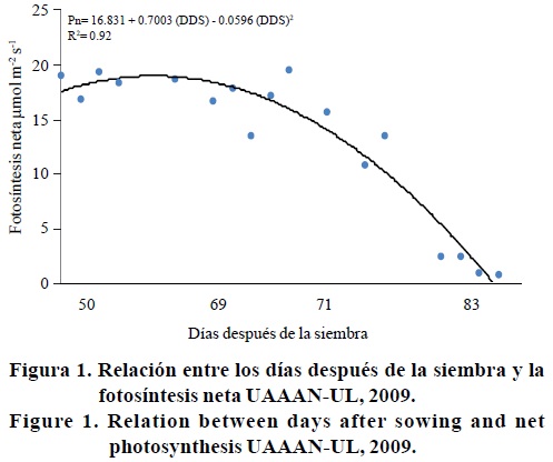 En la Figura 1 se presenta el comportamiento de la asimilación de CO2 en las plantas de frijol, observándose un punto máximo en la actividad fotosintética entre la etapa de floración y maduración fisiológica (50 y 69 DDS); después de los 71 DDS la asimilación de CO2 comienza a decrecer hasta ser prácticamente nula a los 83 DDS antes de la cosecha. Existe una estrecha relación entre los DDS y fotosíntesis neta, la cual se encontró mediante una ecuación polinómica de segundo orden con un coeficiente de correlación de 0.92, lo que indica una predicción confiable que permite estimar la cantidad de CO2 que asimila la planta a lo largo de su ciclo vegetativo.