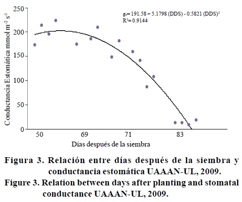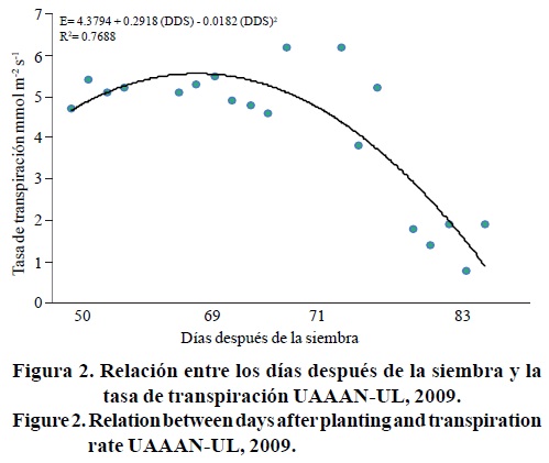 El comportamiento de esta variable fue similar a la fotosíntesis neta. La relación entre los DDS y transpiración se muestra en la Figura 2; con la ecuación polinómica de segundo orden obtenida del análisis de regresión, es posible estimar la transpiración de las plantas de frijol con una confiabilidad de 76%. Sin embargo, a los 71 DDS se presentó un comportamiento inestable en la transpiración, lo que redujo el coeficiente de correlación. La tasa de transpiración máxima se observó durante las etapas de floración y madurez fisiológica (50 y 71 DDS), momento en el cual comenzó a disminuir hasta obtener valores mínimos a los 83 DDS al igual que la Pn.