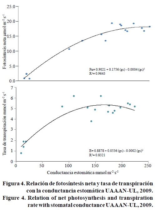 Por otra parte, se buscó relacionar la gs con la fotosíntesis y la transpiración. Los valores de fotosíntesis neta al igual que la transpiración se ajustaron a un modelo polinominal de segundo orden mostrando la estrecha relación de estas dos variables con la conductancia estomatal al obtener un buen coeficiente de correlación (0.96 y 0.83 respectivamente).