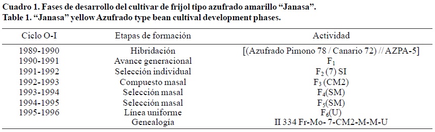 La variedad Janasa se desarrolló por el método genealógico modificado (Ferh, 1987), producto de la cruza de tres genotipos: [(Azufrado Pimono-78 / Canario-72) // AZPA-5]. Ésta se efectúo con el objetivo de incrementar el grado de tolerancia a virosis y el nivel de rendimiento, conservando la calidad de grano de alta demanda comercial de tipo azufrado amarillo. Su desarrollo incluyó cruzamiento, selección individual en F2, selección de compuesto masal en F3y selección masal en F4, F5 y F6, uniformizándo en esta última generación filial. El proceso del mejoramiento genético se desarrolló bajo condiciones de riego durante el ciclo otoño-invierno en el CEVAF-INIFAP, en Los Mochis, Sinaloa.