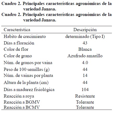 La planta de Janasa es de hábito determinado tipo I (Shoonhoven y Pastor-Corrales, 1987), de porte alto, aunque las puntas de sus vainas entran en contacto con el suelo, con un ciclo intermedio con alrededor de 43 y 104 días a floración y madurez fisiológica, respectivamente. Su peso de cien semillas dependiendo de las condiciones de manejo agronómico, varía de 42 a 44 gramos. La variedad Janasa por sus características se clasifica, al igual que la mayoría de las variedades de tipo Azufrado, dentro de la raza Nueva Granada del Acervo Andino (Singh et al., 1991) Cuadro 2. Por su reacción a enfermedades en el campo, se considera resistente o tolerante.