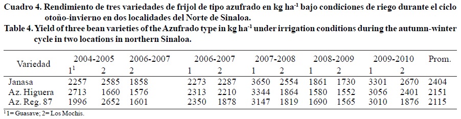 El programa de mejoramiento genético de frijol del Instituto Nacional de Investigaciones Forestales, Agrícolas y Pecuarias (INIFAP) en el Campo Experimental Valle del Fuerte (CEVAF), Sinaloa, se ha enfocado al desarrollo de variedades tipo azufrado de grano grande, con alto potencial de rendimiento, tolerantes a enfermedades y de amplio rango de adaptación. La demanda de este tipo de frijol fluctúa entre 120 y 140 mil toneladas anuales y es considerado como preferente para el consumo (Castellanos et al., 1997). En Sinaloa durante el otoño-invierno 2009-2010 se cultivaron 137 685 ha con frijol y se obtuvo una producción de 225 198 t, obteniendo un rendimiento medio de 1.78 t ha-1 (SAGARPA, 2010). Sin embargo, en la actualidad más de 70% de la superficie cultivada con frijol en el estado se establece con la variedad Azufrado Higuera (Salinas y Rodríguez, 2008), lo que representa un riesgo para la manifestación de una epifitiapor la reducida diversidad genética utilizada. Por ello, recientemente se describió la variedad 'Azufrasin' (Salinas et al., 2010) y ahora se describe la variedad Janasa, la que ha mostrado un diferencial de rendimiento superior de 322 kg ha-1, en relación a Azufrado Higuera y con un alto grado de tolerancia a virosis y moho blanco y resistencia a roya.