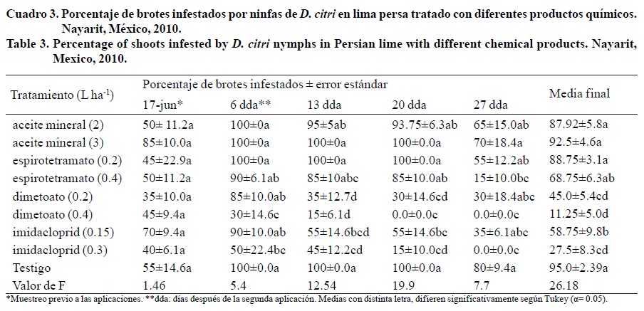 Porcentaje de brotes infestados con ninfas. Seis días después de las aplicaciones, se observaron diferencias significativas entre tratamientos (Cuadro 3). El tratamiento con dimetoato en la dosis mayor fue el mejor tratamiento y ejerció control 70% de brotes respecto al testigo, le siguió el imidacloprid en la dosis mayor con 50% de control; los tratamientos con aceite mineral y espirotetramato con la dosis menor fueron iguales al testigo. En el segundo muestreo, 13 días después de las aplicaciones, ocurrieron diferencias significativas, los tratamientos con dimetoato en las dosis evaluadas e imidacloprid con la dosis mayor, ejercieron un control 85%, 75% y 55%, respectivamente, comparados con control. Los tratamientos con aceite mineral en la dosis mayor y espirotetramato en la dosis menor presentaron igual porcentaje de brotes infestados que el control. En el penúltimo muestreo, se observaron diferencias significativas entre los tratamientos, destacan los tratamientos con dimetoato e imidacloprid en la dosis mayor con 100% y 85% de control, respectivamente. Los demás tratamientos, excepto aquellos con dimetoato e imidacloprid en las dosis menores, fueron estadísticamente iguales al control. En el último muestreo, 27 días después de las aplicaciones, los tratamientos con dimetoato e imidacloprid en las dosis mayores fueron diferentes al control y ejercieron 100% de control. El espirotetramato con la dosis mayor ejerció 85% de control de brotes. El mayor número de brotes infestados se obtuvo con el aceite mineral, lo cual coincide con un mayor número de ninfas (Cuadro 2).