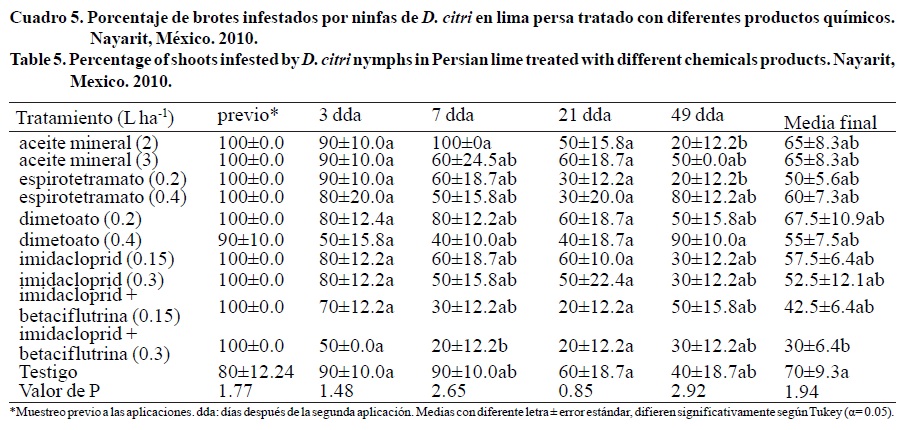En el segundo muestreo, 13 días después de la segunda aplicación, se observaron diferencias significativas entre los tratamientos. El dimetoato con las dosis evaluadas, ejerció control de más de 95.3%, seguido por imidacloprid 89.5% de control respecto al testigo. En la penúltima fecha de muestreo, 20 días después de la aplicación ocurrieron diferencias estadísticamente significativas entre tratamientos. El dimetoato con la dosis mayor ejerció 100% de control, los tratamientos con espirotetramato, dimetoato e imidacloprid en la dosis baja fueron iguales estadísticamente entre si y diferentes al control, estos ejercieron control de ninfas de más de 54%; en este muestreo el aceite mineral en la dosis menor presentó estadísticamente igual número de ninfas por brote que el control. Con el aceite se percibió un control relativamente bajo comparado con el control, en general mostró poca efectividad (50.3% en promedio) incluso en el muestreo después de la segunda aplicación (27 días) el control fue menor 41%. El aceite mineral sobre las ninfas de D. citri tiene mayor control sobre ninfas de 1er y 2do instar y se obtienen mejores resultados aplicándolo en forma preventiva, antes de la llegada de los adultos (Rae et al., 1997). Resultados satisfactorios de control obtuvieron Childers y Rogers (2005) a los cinco y 13 días después de la aplicación de 46.7 L.ha-1 de aceite mineral a 97% en naranja. No obstante, este control fue insignificativo a los 13 días después de la aplicación.