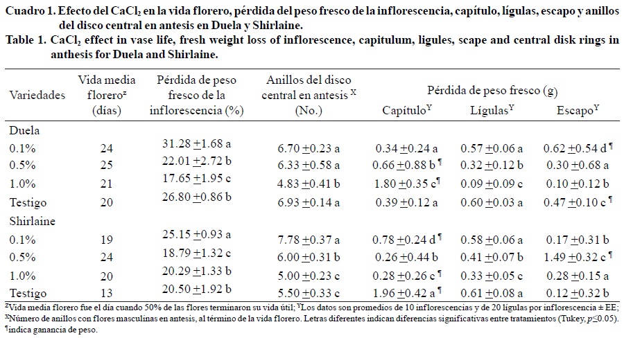 La mayor pérdida de peso se observó en la concentración 0.1 % en las dos variedades. En contraste las concentraciones 0.5% y 1.0% redujeron la pérdida de peso en comparación con el testigo. No obstante la concentración de calcio afecto retrasando la apertura de anillos (Cuadro 1). En el caso de las lígulas estas siguieron la misma tendencia que la flor completa mientras que el capítulo y escapo mostraron variación, incluyendo algunas ganancias de peso (Cuadro 1).