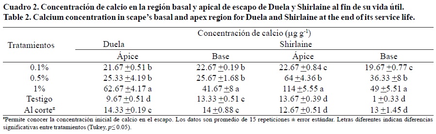 La concentración Ca+2 al corte no presentó variación entre variedades. Las flores que acumularon mayor concentración de Ca+2 en los escapos fueron las tratadas con 0.5% y 1.0% de CaCl2 especialmente en la región apical, siendo más marcada esta tendencia en Shirlaine; la cual acumuló nueve veces más Ca+2 que el testigo. En Duela las concentraciones de 0.1% y 0.5% no presentaron diferencias significativas entre regiones del escapo, en tanto que en la concentración de 1.0% si se presentaron (Cuadro 2).