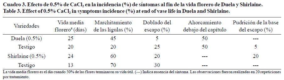 Los síntomas más frecuentes en la senescencia de Shirlaine fueron el doblado del escapo (3 0%) y el marchitamiento de las lígulas (70%), mientras que en Duela el ahorcamiento debajo del capítulo fue el principal síntoma de senescencia, y el doblado del escapo fue 25%. El principal efecto del calcio fue en la reducción del doblado del escapo con respecto al control; 20% en Duela y 10% en Shirlaine (Cuadro 3).