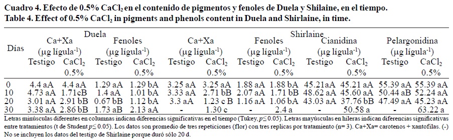 En Duela no se detectó presencia de antocianinas, por lo cual, sólo se reportan carotenos y fenoles. La concentración de carotenos en las lígulas se redujo significativamente en los tratamientos con CaCl2. Estos resultados indican que el CaCl2 aceleró la degradación de estos pigmentos, en Shirlaine disminuyó 40% y en Duela 65% al fin de la vida florero.