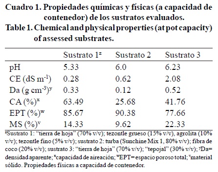 Una vez mezclados los diferentes componentes, los sustratos se analizaron en laboratorio para determinar algunas propiedades físicas como densidad aparente, densidad real, espacio poroso total, así como proporción de agua, aire y material sólido a capacidad de contenedor; las determinaciones se llevaron a cabo en un medidor de tres fases del suelo, marca Daiki, modelo DIK 1120, con modificaciones al protocolo para adaptarlo a sustratos; dicha modificación consistió en tomar la muestra de cada sustrato a capacidad de contenedor, mediante el cilindro metálico de volumen conocido que normalmente se usa para tomar muestras de suelo en campo, para de ahí determinar en el equipo las proporciones de aire, sólidos y agua presentes en la muestra de sustrato. Las propiedades químicas evaluadas fueron pH y conductividad eléctrica, usando una proporción sustrato: agua de 1:1.5. Los sustratos no se esterilizaron previo a su uso.