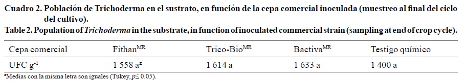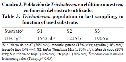 En lo que respecta al efecto del sustrato sobre la población de Trichoderma al final del ciclo del cultivo, no hubo diferencias estadísticas significativas (Cuadro 3).