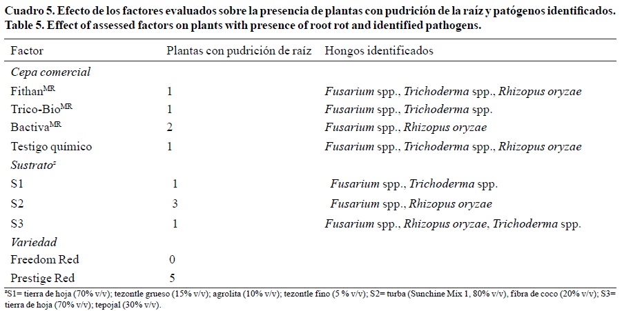 En general, se tuvo una incidencia baja de plantas con pudrición de la raíz (Cuadro 5); la enfermedad se presentó solamente en la variedad Prestige Red y se asoció con el sustrato de turba+fibra de coco, debido probablemente a su elevada retención de humedad (Cuadro 1).