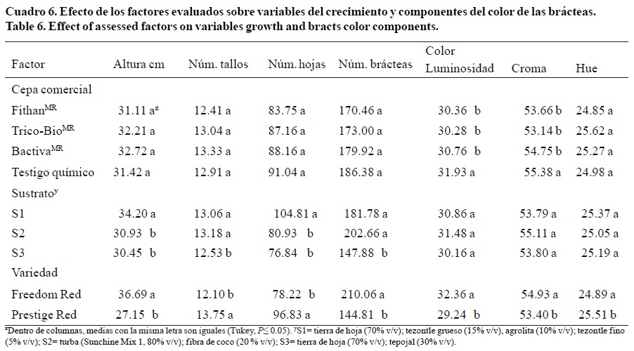 El sustrato 1 tuvo valores más altos (p≤ 0.05) de las variables altura de planta y número de hojas, respecto a los otros dos sustratos; el sustrato 3 (testigo comercial), tuvo los valores más bajos (p≤ 0.05) de todas las variables del crecimiento, mientras que en el sustrato 2 no se encontraron diferencias significativas con el sustrato 1 en las variables número de tallos y número de brácteas (Cuadro 6). Ningún componente del color fue afectado significativamente por el factor sustratos (Cuadro 6).