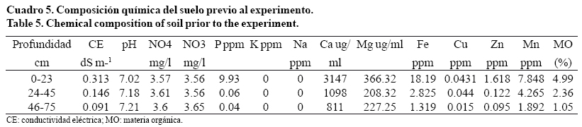 Aplicando la NOM-021-RECNAT-2000, que establece las especificaciones de fertilidad, salinidad, clasificación e interpretación de resultados, considera el contenido de MO es alto, pH neutro, la disponibilidad de P como media en el caso de micronutrientes la disponibilidad de Fe, Zn y Mn como adecuada, la concentración P lo clasifica en media y para Cu como deficiente, la CE se considera con efectos despreciables de salinidad; lo anterior para la profundidad de los 0 a 23 cm. En los otras dos capas (24 a 45 cm y 46 a 75 cm) la clasificación para micronutrientes va marginal a deficiente, P bajo, MO va de medio a bajo, disminuyendo con la profundidad; el pH y la CE conservó el mismo rango de clasificación (Cuadro 5).