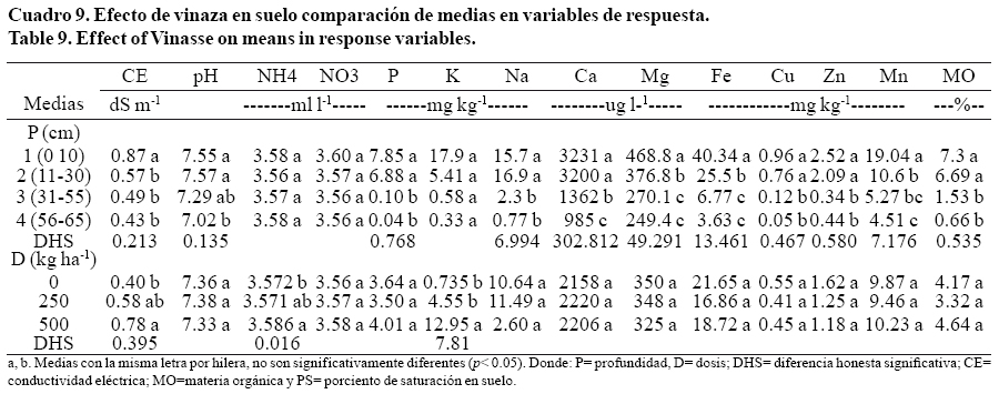 En la prueba de medias para las variables de respuesta significativas (p> 0.05), P y para las bases intercambiables (Na, Mg y Ca) en profundidad para el caso de P y Na, las profundidades 1 y 2 fueron estadísticamente diferentes de 3 y 4; los valores de las profundidades 1, 2 y 3 fueron estadísticamente diferentes entre sí, la 3 y 4 fueron iguales en relación al contenido de Mg; En el caso de Ca las profundidades 1 y 2 fueron estadísticamente diferentes de las profundidades 3 y 4. Las concentraciones de P, Na, Mg y Ca; fueron mayores en la profundidad 1, decreciendo en los siguientes estratos; como lo indican Bautista et al. (2000a), encontrando un aumento en el contenido de Mg y Ca intercambiable, al aplicar vinaza al suelo; lo cual es posible ya que el Ca y Mg y otros iones se encuentren fuertemente retenidos entre las arcillas del suelo y por el efecto de la materia orgánica contenida en vinaza.