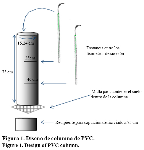 Se emplearon 6 tubos de cloruro de polivinilo (PVC) de diámetro interior de 15.24 cm y 75 cm de longitud (Figura 1). En la parte inferior del tubo o columna se colocó malla de plástico con orificios de apertura menor a 1 mm; para contener el suelo dentro de la columna y no interrumpir el flujo del lixiviado a la parte inferior (75 cm); la malla fue sujeta con alambre galvanizado al tubo de PVC. Para el llenado de columnas se cavó un perfil de 80 cm de profundidad en la zona aledaña al Ingenio El Potrero, se tomaron muestras de suelo a tres profundidades para análisis de fertilidad, se instalaron 2 lisímetros de succión por columna (23 y 46 cm de profundidad) se llenó con 12.8 dm3 de suelo a cada columna, al finalizar el experimento se extrajo el suelo de cada columna, a cuatro profundidades (0-10, 11-30, 31-55 y 56-65 cm). Las columnas fueron llevadas al invernadero del Campus Montecillo; donde se colocaron sobre una estructura, asegurando una posición vertical para captar el lixiviado de la parte inferior de la misma.