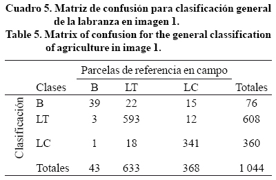 Para evaluar la clasificación de manera objetiva se juntaron las clases SD1 y SD2 en LC, y C1, C2 y SD3 en LT, tanto para los resultados de la clasificación como para los registros del muestreo de campo y se elaboró la matriz de confusión mostrada en el Cuadro 5. Además también el índice Kappa mostró aumento en el acuerdo entre las referencias de campo y los resultados de clasificación, siendo de 0.9396 para LT y 0.9208 para LC, lo que indicó un muy buen acuerdo en ambos casos. Se clasificaron correctamente 93.7% de referencias de LT, y 92.7% de LC. Con respecto al número total de aciertos que tuvo la clasificación en términos de LT y LC se obtuvieron 973 parcelas clasificadas correctamente de las 1 044 verificadas, lo que representa 93.2%.