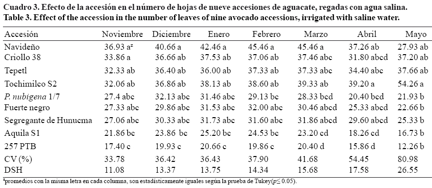 La accesión con mayor número de hojas presentes en la planta al final del experimento fue Navideño cuyas plantas presentaron 40 hojas en promedio, mientras la accesión 257 PTB sólo tuvo al final 20 hojas. La diferencia en el número de hojas entre accesiones tuvo estrecha relación con la diferencia en el crecimiento de altura de la planta, como fue el caso de Aquila S1 y 257 PTB, las cuales se mantuvieron en el grupo que mostró valores más bajos en incremento acumulado mensual de altura de planta (2.10 y 4.73 cm, respectivamente) (Cuadro 1) y en incremento del diámetro de planta (0.14 y 0.17 mm, respectivamente) (Cuadro 2). Resultados similares han sido reportados por Musyimi et al. (2008), quienes señalaron que una de las causas de la reducción del crecimiento en aguacate por la salinidad, se debe a la reducción en la acumulación de biomasa, necrosis foliar y reducción del número de hojas por muerte o senescencia.