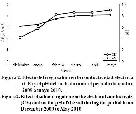 La aplicación del riego con agua salina modificó gradualmente la CE y el pH del suelo. En el periodo de diciembre-enero ambos se incrementaron, y de ahí hasta el final del experimento se mantuvieron casi constantes (Figura 2). Los valores de CE superiores a 4 dS m-1 y pH de 8.5 en el suelo, y la calidad del agua utilizada para el riego con una CE de 3 dS m-1 clasificada como agua moderadamente salina (Rhoades, 1992), indican las condiciones críticas de salinidad a las que estuvieron expuestas las plantas de aguacate, las cuales se reflejan en el grado de reducción de la altura de la planta, diámetro del tallo y número de hojas por efecto del déficit hídrico (Oster etal, 2007), según se ha mencionado antes.