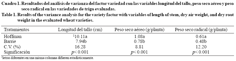 La longitud del tallo, peso seco aéreo y peso seco radical difirieron (p< 0.001) sólo al comparar las variedades de trigo probadas. En el Cuadro 1 se observa que para la longitud del tallo, Hoffrnan muestra un comportamiento superior (10.11 cm). También esta misma variedad se mantiene por encima de Barrie para el peso seco aéreo (1.08 g/planta) y el peso seco radical, con 0.61 g/planta.