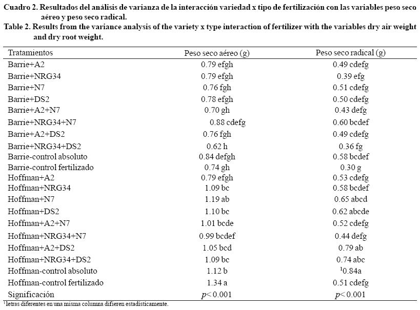 Esta tendencia de la influencia de la variedad en los resultados agroproductivos se observó también en la interacción de los factores variedad x tipo de fertilización, la cual presentó en el análisis de varianza diferencias significativas (p< 0.001) ante peso seco aéreo y peso seco radical. En el Cuadro 2 se observa, en peso seco aéreo, que los tratamientos más sobresalientes fueron Hoffman-fertilizado (1.34 g), Hoffman+N7 (1.19 g) y Hoffman-control absoluto (1.12 g). El primer tratamiento fue estadisticamente superior al resto, excepto Hoffman+ N7. Es evidente la marcada influencia del factor variedad en dicha interacción de factores, pero también la población autóctona de la rizosfera debió jugar un papel importante. Según Chelius y Triplett (2000) estas rizobacterias, al igual que las introducidas, se asocian a las raices de la planta debido a la influencia de compuestos orgánicos producto de los exudados radicales, como carbohidratos, ácidos orgánicos y factores de crecimiento microbiano. Una prueba de ello fue, que en peso seco radical, aunque persistió la influencia varietal en los resultados, los valores estadisticamente superiores correspondieron a Hoffman-control absoluto (0.84 g), el cual compartió superindices comunes con Hoffman+A2+DS2 (0.79 g), Hoffmann+NRG34+DS2 (0.74 g), Hoffman+N7 (0.65 g) y Hoffman+DS2 (0.62 g). Al igual que en peso seco aéreo, los valores inferiores correspondieron a los tratamientos de la variedad Barrie.