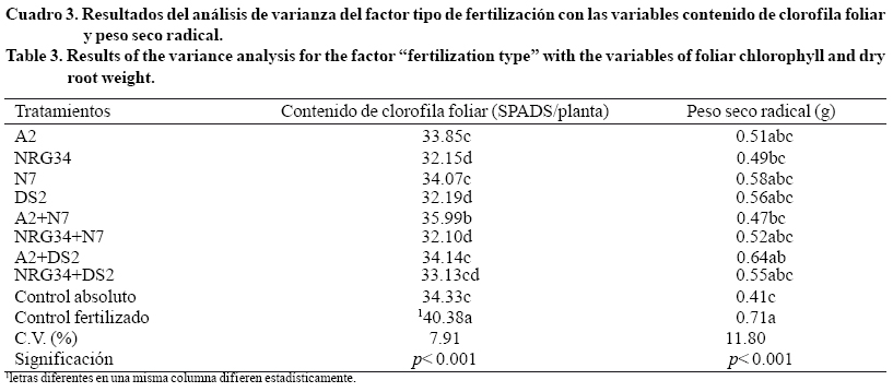 Se constató, por otra parte, que las combinaciones de A2+DS2 (34.14 SPADS/planta) y NRG34+DS2 (33.13 SPADS/planta), así como las aplicaciones simples de A2 (33.85 SPADS/planta) y N7 (34.07 SPADS/planta) y el control absoluto (34.33 SPADS/planta), compartieron superíndices comunes y presentaron valores por debajo de los tratamientos antes mencionados, aunque fueron estadísticamente superiores (p< 0.001) a NRG34+N7 y a NRG34 (Cuadro 3).
