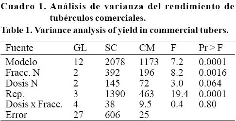 El análisis de varianza del rendimiento de tubérculos comerciales se presenta en el Cuadro 1, el cual indica que hubo un efecto significativo (P= 0.002) del nivel de fraccionamiento del nitrógeno y también de la dosis de nitrógeno (P= 0.064). La producción de tubérculos no comerciales (promedio de 6.48 t ha-1 en todo el experimento) también se analizó estadísticamente, sin embargo no se tuvo ningún efecto significativo de las dosis de nitrógeno ni de su distribución, por lo que en la Figura 1 sólo se presentan los resultados del rendimiento comercial. En esta figura se puede observar que los tratamientos en los que la aplicación del nitrógeno se hizo en 1 y 2 partes (N/1 y N/2), los rendimientos promedio fueron de 39.52 y 39.45 t ha-1 respectivamente. Estos rendimientos fueron superiores al del tratamiento N/4 (32.48 t ha-1) en el que el N se fraccionó en 4 partes. La disminución del rendimiento con el nivel de fraccionamiento del nitrógeno observado en este estudio está de acuerdo con lo encontrado por Kuisma (2002) y también por Miller and Rosen (2005), pero se opone a lo observado por Westermann y Kleinkopf (1985) y Errebhi et al. (1998). Estas diferencias se pueden explicar por lo expresado por Zebarth and Rosen (2007), quienes observaron que la respuesta a la forma en que se fracciona el nitrógeno está determinada principalmente por las condiciones del suelo, el clima y el manejo del riego.