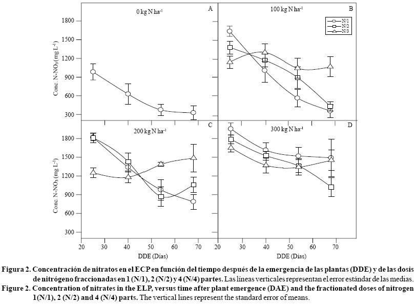 Al comparar los cambios de concentración de nitrato en el ECP que ocurrieron durante el periodo de desarrollo de las plantas en los tratamientos con los tres niveles de fraccionamiento de nitrógeno (Figura 2), se observa una disminución a través del tiempo en los tratamientos N/1 y N/2 con las tres dosis de nitrógeno, pero no en los tratamientos N/4.