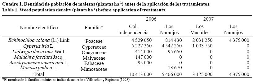 En total se identificaron seis especies de malezas anuales, pertenecientes a seis familias botánicas, cuya densidad de población promedio antes de la aplicación de los tratamientos, variaba de 3 125 000 a 10 413 000 plantas ha-1. En todas las parcelas las especies dominantes fueron el zacate pata de pichichi y el pelillo, que en conjunto ocuparon entre 93.7 y 100% de la población total de malezas. En las dos parcelas de 2006, se presentaron pequeñas poblaciones de malezas de hoja ancha, mientras que en 2007, no hubo presencia de éstas (Cuadro 1).