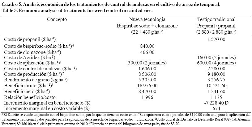 El costo del tratamiento de bispiribac-sodio + clomazone, incluyendo su aplicación, fue casi 30% menor que el tratamiento de dos aplicaciones de propanil, por lo que el costo de producción del cultivo considerando al nuevo tratamiento se redujo 7.34%. Debido a lo anterior y al mayor rendimiento de grano obtenido con la nueva tecnología, el beneficio bruto de ésta fue 62.9% mayor que con el tratamiento tradicional, y el beneficio neto fue casi siete veces mayor, cuya relación beneficio/costo fue de 1.996, mientras que con el tratamiento de control tradicional basado en el propanil, ésta fue mínima (Cuadro 5). Este último tratamiento fue dominado por la nueva tecnología, al proporcionar una menor utilidad neta y tener un mayor costo variable (CIMMYT, 1988), con lo cual se corroboran las desventajas económicas de su aplicación.