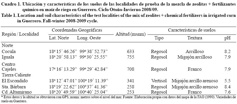 Durante el ciclo agrícola Otoño-Invierno 2008/09, en diversas localidades de las regiones Norte, Centro y Tierra Caliente de Guerrero, cuya localización geográfica y características de suelo se indican en el Cuadro 1, se establecieron bajo riego seis parcelas de validación (PAVAL) de maíz con el fin de validar y demostrar la respuesta del cultivo a las dosis de fertilización basadas en la mezcla de zeolita en polvo (ZP) y zeolita granulada (ZG) con fertilizantes químicos. Respecto a los tipos de suelo en que se efectuaron las pruebas, cabe resaltar que los regosoles se caracterizan por ser delgados, provienen de materiales no consolidados y carecen de propiedades gléyicas y sálicas dentro de los primeros 50 cm, mientras que los vertisoles se agrietan con facilidad y contienen 30% o más de arcilla hasta al menos la profundidad de 50 cm (Ortiz et al., 1994). Según Reyes et al. (1995) los regosoles figuran en primer lugar al ocupar el 32.6% de la superficie estatal, mientras que los vertisoles sólo cubren el 1.8%; y las texturas dominantes son la media y gruesa (89.3%), y en menor cuantía la fina (10.7%).
