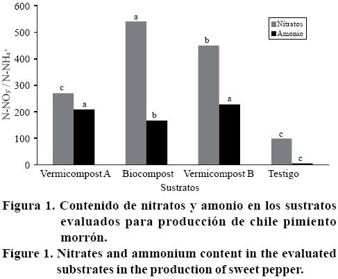 El contenido de nitratos en el estrato 0-7 cm de profundidad presento alta significancia. La comparación de medias identifica a Biocomposta como el de mayor contenido de nitratos con un valor de 540.51 mg kg-1 seguido de Vermicomposta (VB) con 350.47 mg kg-1 (Figura 1). Ansorena (1994) menciona que el contenido óptimo de nitratos para el cultivo de pimiento va de 100 a 300 mg kg-1.