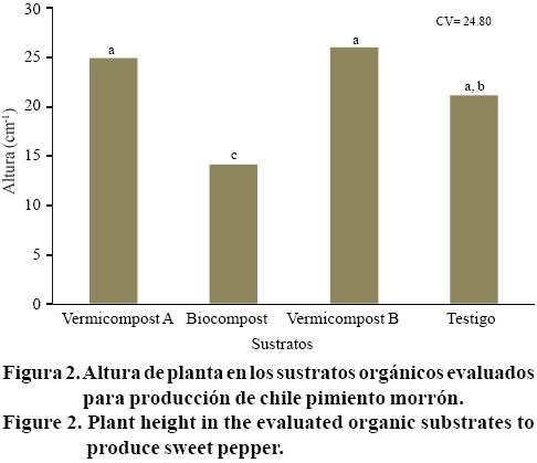En Biocompost se encontro la menor altura de planta esto puede explicarse por las propiedades físicas de este sustrato puesto que no tuvo las caracteristicas favorables para el desarrollo del cultivo como fue: la aireación por efecto de la compactación que este sustrato presentó, al cual ademas tenía una alta CE (12 dS m-1) lo que impidió un desarrollo normal tanto de las raíces como de las plantas. Efectos similares fueron encontrados por Zobel (1995) y Magdaleno et al. (2006) al emplear sustratos en la producción de tomate de cascara. Aunque Moreno et al. (2005) mencionan que la altura de planta para el caso de tomate no varía a diferentes porcentajes de compost más arena.