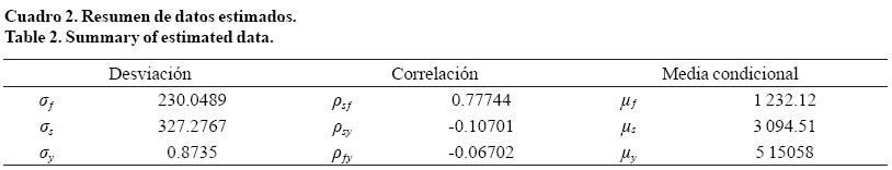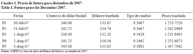 Las medias condicionales, coeficientes de correlación y desviaciones estándar estimadas son reportadas en el Cuadro 2. El tamaño de un contrato de futuro es de 5 000 bushels, que equivale aproximadamente a 127 toneladas, para producir tal cantidad se considera una superficie (q) de 25 hectáreas.