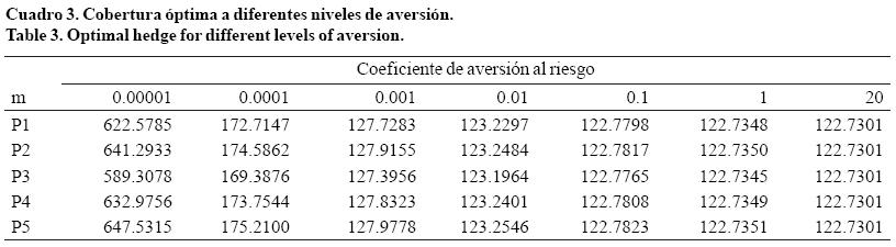 La cobertura óptima se encuentra bajo (18) donde pf es el precio de futuro que el productor acuerda en el contrato cuando inicia la producción, el precio futuro en ese momento se aprecia en el Cuadro 1.