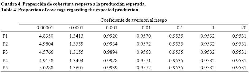 En el Cuadro 4 se observa el tamaño de la cobertura en proporción de la producción esperada. Para un productor cuya aversión al riesgo es cercana a cero, la cobertura con contratos de futuro debe ser entre 4.5 y 5 veces más que la producción esperada, conforme aumenta el nivel de aversión, la cantidad a cubrir disminuye, hasta llegar a 95% cuando el coeficiente de aversión es mayor o igual a 0.01.