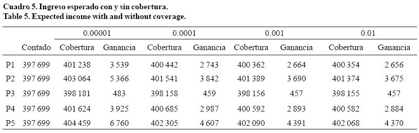 Es evidente que si no se utiliza cobertura, la parte relativa al mercado de futuros en (22) no existe. En el Cuadro 5, se realiza una comparación del ingreso esperado cuando el productor se cubre y cuando sólo espera su ingreso en el mercado de contado. En todos los casos hay una ganancia pequeña pero positiva cuando se utiliza una cobertura óptima. Se debe resaltar que el objetivo de utilizar contratos de futuro, es disminuir el riesgo o estabilizar el ingreso y no precisamente obtener una ganancia. Sin embargo, a todos los precios (pf) considerados el sesgo es positivo razón por la cual en el Cuadro 5 se observan mayores ingresos cuando se utiliza la cobertura.