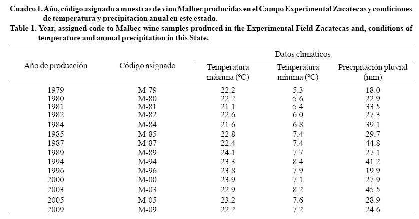 Material biológico. Se utilizaron muestras de vino tinto producidos con la variedad de uva Malbec (Cuadro 1). La uva fue cosechada en el Campo Experimental Zacatecas y el vino se preparó con el método tradicional de vinificación: 1) prensado; 2) maceración por tres semanas; y 3) fermentación por 10 días; y 4) crianza y añejamiento en botella. En octubre de 2010 se retiraron de la cava de este Campo dos botellas de vino de 200 mL de los años que se muestran en el Cuadro 1. Estas botellas han sido conservadas bajo una temperatura y humedad relativa promedio de 25 °C y 80%, respectivamente.