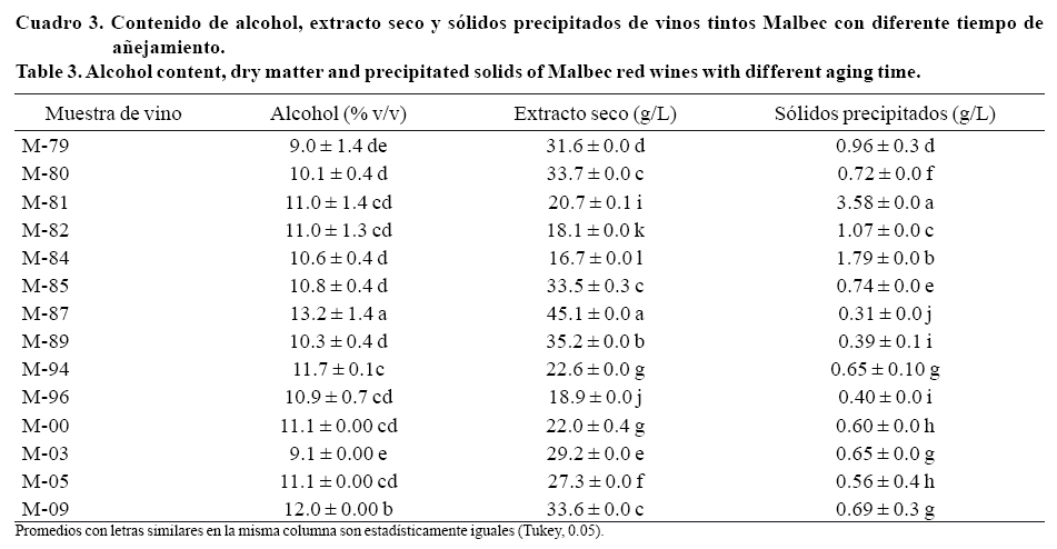 Por otro lado, los SP son sales cristalizadas en su mayoría de tartrato ácido de potasio y complejos insolubles formados por polímeros de flavanoles unidos entre sí y con otros compuestos, fenómeno que se da en general en vinos con periodos prolongados de añejamiento (Jackson y Lombard, 1993; Waterhouse, 2002; Jackson, 2008). Este comportamiento se observó en cierto grado en los vinos analizados; es decir, las muestras M-79 a M-85 presentan mayor contenido de SP que las muestras M-00 a M-09. Sin embargo, Las muestras M-87, M-89 y M-96 presentaron menor contenido de SP que los vinos más jóvenes. Con base en los análisis realizados aquí, no es posible explicar este comportamiento.