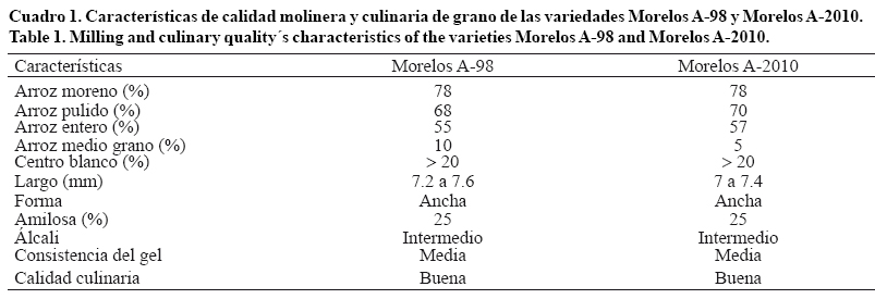 La longitud del grano del arroz descascarado, integral o sin pulir es de 8.2 mm y su anchura es de 2.8 mm. El espesor del grano es 2.1 mm, el color predominante del pericarpio es crema claro y sin olor. El contenido de amilosa del arroz pulido es 25%, el endospermo es traslúcido, con centro blanco mayor a 20%, el peso de mil granos es de 32 g y una intermedia temperatura de gelatinización. Las características de calidad molinera y culinaria de las variedades Morelos A-98 y Morelos A-2010 se muestran en el Cuadros 1.