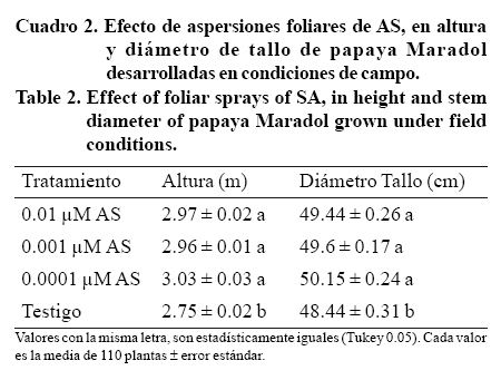 En el Cuadro 2, se presentan los resultados en el que evidencia el efecto positivo de cualquiera de las concentraciones probadas del AS en las variables de altura y diámetro del tallo de la papaya. El hecho notorio es que aplicaciones de concentraciones de fentomolas fue el mejor tratamiento. Incremento en 10% la altura de la planta en comparación con el control, en tanto que la concentración de 0.01 μM en 8% dicho crecimiento.
