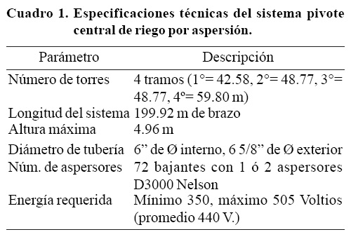 El equipo de riego es un pivote central y consiste en una estructura de tubos y ángulos de acero galvanizado acoplado al sistema de rodamiento, alineación, energía eléctrica y operación (Cuadro1 y Figura 2).