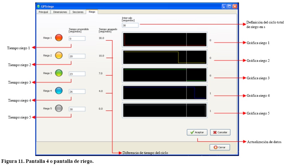 La "pantalla de riego" especifica el tiempo total del ciclo de riego (recuadro intervalo), el cual se define en segundos y está en función de la velocidad del equipo y el criterio del operador, para ello se recomienda tiempos de 30, 60 ó 120 segundos. Al definir el total del ciclo se establece la duración de apertura de cada uno de los 5 tipos de riego, siendo generalmente el 1 (color rojo) de cierre total o sin riego y el 5 (color gris) de apertura total o siempre riego, dejando el 2, 3 y 4 para especificar la cantidad de segundos que resulte de la necesidad de lámina requerida para las diferentes zonas. El programa calcula la duración del tiempo que las válvulas permanecen cerradas en cada uno de los tipos de riego.