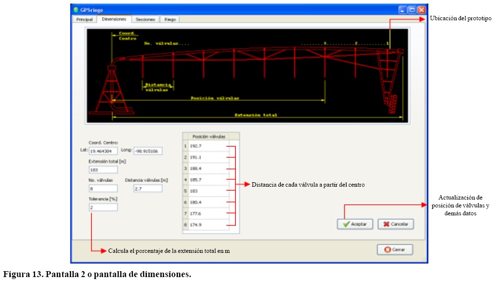 Cada sección debe tener su cantidad de grados de acuerdo al mapa elaborado por interpolación de una variable física del suelo. Para el estudio en cuestión es la conductividad eléctrica, es importante indicar que los valores del ángulo son acumulativos y no deben exceder los 360°, en caso de tener secciones fuera de este rango se deberán borrar. Cuando se especifica el ángulo de la sección es necesario colocar el número de riego que se debe dar (para nuestro caso son 5 tipos), para cada válvula. Al final se actualiza la pantalla, el programa estima las coordenadas (latitud y longitud) de cada uno de los ángulos considerados para las secciones, que son los que se comparara con los datos tomados por el GPS, enseguida se especifican las dimensiones y datos en la pantalla 2 (Figura 13).