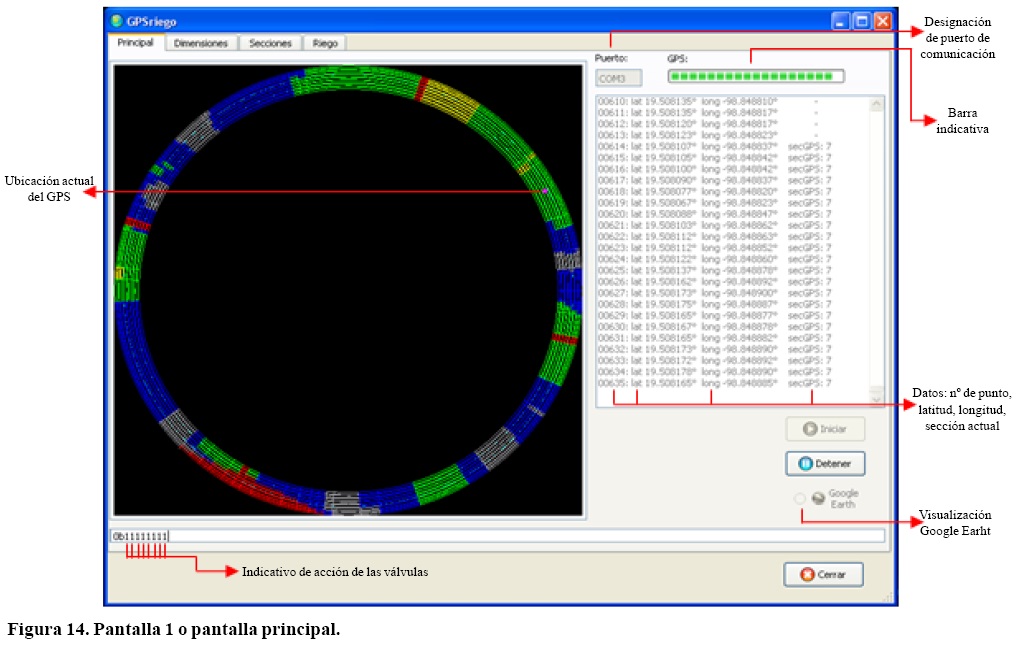 La pantalla principal también muestra en forma gráfica la extensión de todas las secciones y el tipo de riego que se aplica de acuerdo a los colores establecidos en la pantalla de riego, en esta área se aprecia la posición exacta del GPS y su ubicación dentro del límite de tolerancia graficado con círculos de color celeste. También, refleja el área de riego que alcanza a cubrir cada una de las válvulas. En la parte inferior tiene una barra numérica que muestra el funcionamiento individual de las válvulas en operación, siendo "1" cuando está abierta y "0" cuando está cerrada. Se tiene las opciones de "inicio" de funcionamiento del programa y el de "detener" los cuales son dependientes, es decir cuando uno está "activado" el otro se encuentra ejecutando su función y en forma "inactiva".