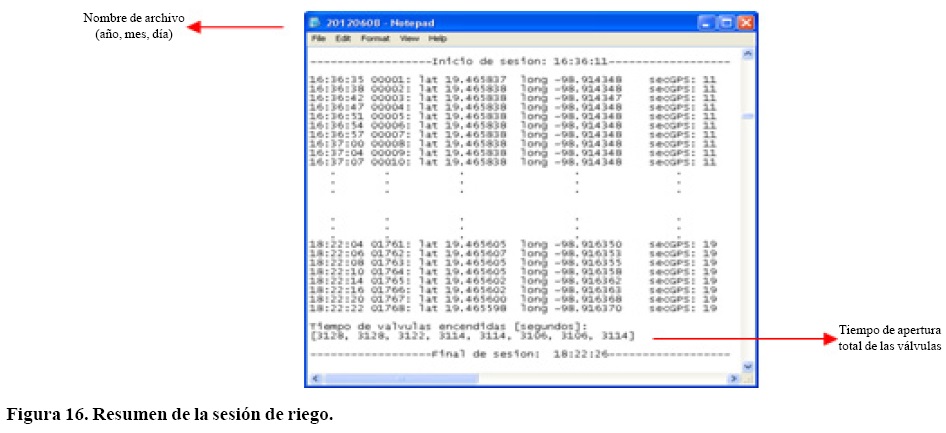 Evaluación del sistema de riego. Al término del riego, el programa imprime los datos en un archivo de texto con el nombre que reúne el "año mes y día" del riego, este documento contiene la hora del inicio de riego, una lista con la hora exacta del momento de riego, un valor correlativo del dato, latitud y longitud en grados decimales y la sección en la que se regó. Se crean tantas líneas como dure el riego a intervalos de 1 a 5 segundos, dependiendo de la capacidad con que se registre la actualización. Se hace una acumulación del tiempo para cada válvula abierta. La sesión finaliza considerando la hora de término de riego (Figura 16 y 17), este archivo se actualiza cada vez que se termine el riego y se cierre el programa. Se crean archivos para cada día de riego en forma independiente, inicia su registro a las 00:00:00 am y termina a las 11:59:59 pm.