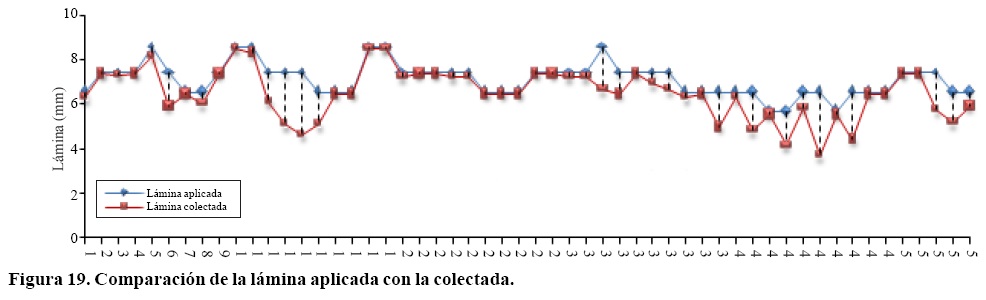 La Figura 19 muestra la variación entre la lámina aplicada y la colectada en promedio 8.41% atribuido al efecto del viento, la influencia de la vegetación al momento de la colección en las canaletas y los desfases de operación de las electroválvulas al momento de la apertura y cierre.