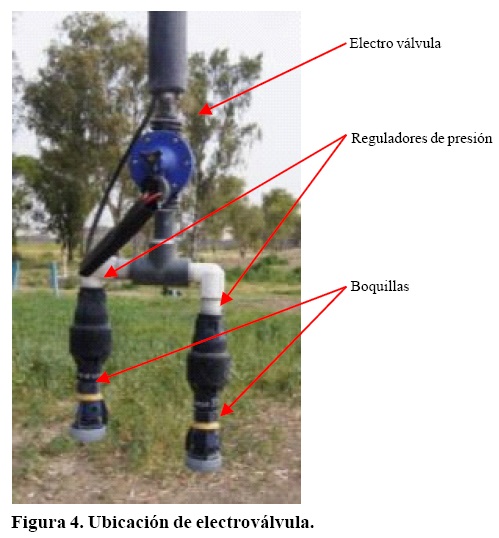 Posteriormente, se hizo el cableado (cable de uso rudo núm. 18) desde el sistema de control a cada una de las electroválvulas con la finalidad de tener un control individualizado de cada salida. Se aprovechó el cable adjunto que conduce la energía del panel central del pivote y las mangueras bajante para fijar el cable. La longitud total para la conexión a ocho válvulas equidistantes en 2.7 m y con el sistema de control intermedio fue de 90 m.
