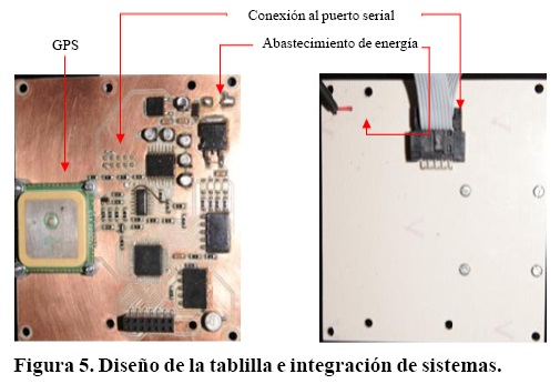 Sistema electrónico. Se inició con la ubicación del GPS LS20031 (Electronics, 2012a) y la adaptación de cinco cables soldados a la tablilla construida. El GPS se puso expuesto en la parte superior para facilitar la ubicación de satélites y evitar interferencias.